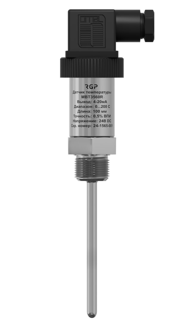 Преобразователь температуры врезной MBT3560R в корпусе DIN 4365 (A), платой нормирующего преобразователя с унифицированным выходным сигналом 4–20 мА и сенсором Pt1000, размещенным в резьбовом штуцере из нержавеющей стали AISI304, который установлен в гильзе с помощью термопроводящего герметика. Датчик предназначен для измерения температуры жидкости в трубопроводах вентиляционных систем, индивидуальных тепловых пунктов и котельных. Степень защиты корпуса от внешних воздействий IP65.