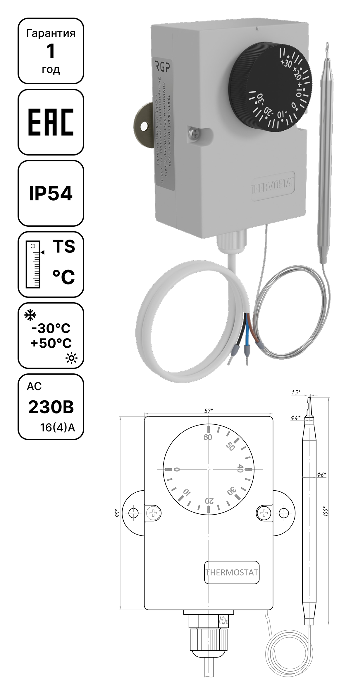 | TS-K1.5-060 | Термостат для помещений IP54 (капилляр 1,5 м, диапазон 0…+60 °C) |