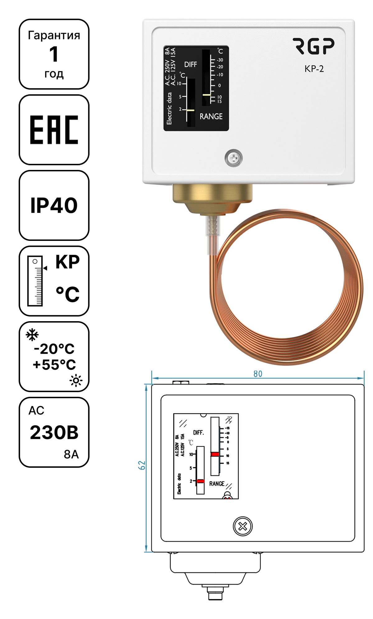Реле температуры (капиллярные защитные термостаты) применяются для регулирования температуры в системах ОВК, но основной функцией является защита жидкостного калорифера вентиляционной установки от замораживания в зимний период. Термореле с длиной капилляра от 1 до 12 метров производятся в Китае по заказу и под контролем компании RGP. Температурные реле отличаются простотой настройки, установки, подключения и надежностью в эксплуатации. Длина капиллярной трубки выбирается при заказе.