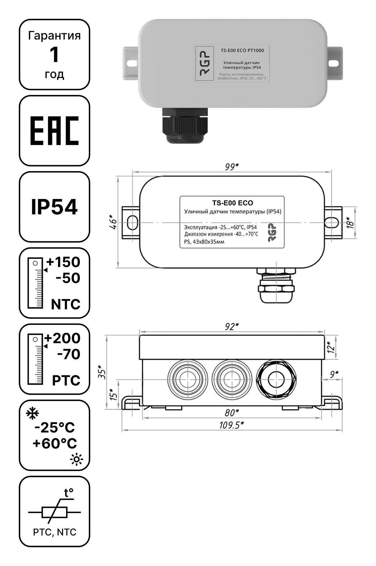 | TS-E00 ECO PT1000 | Уличный датчик температуры PT1000 (IP54) |