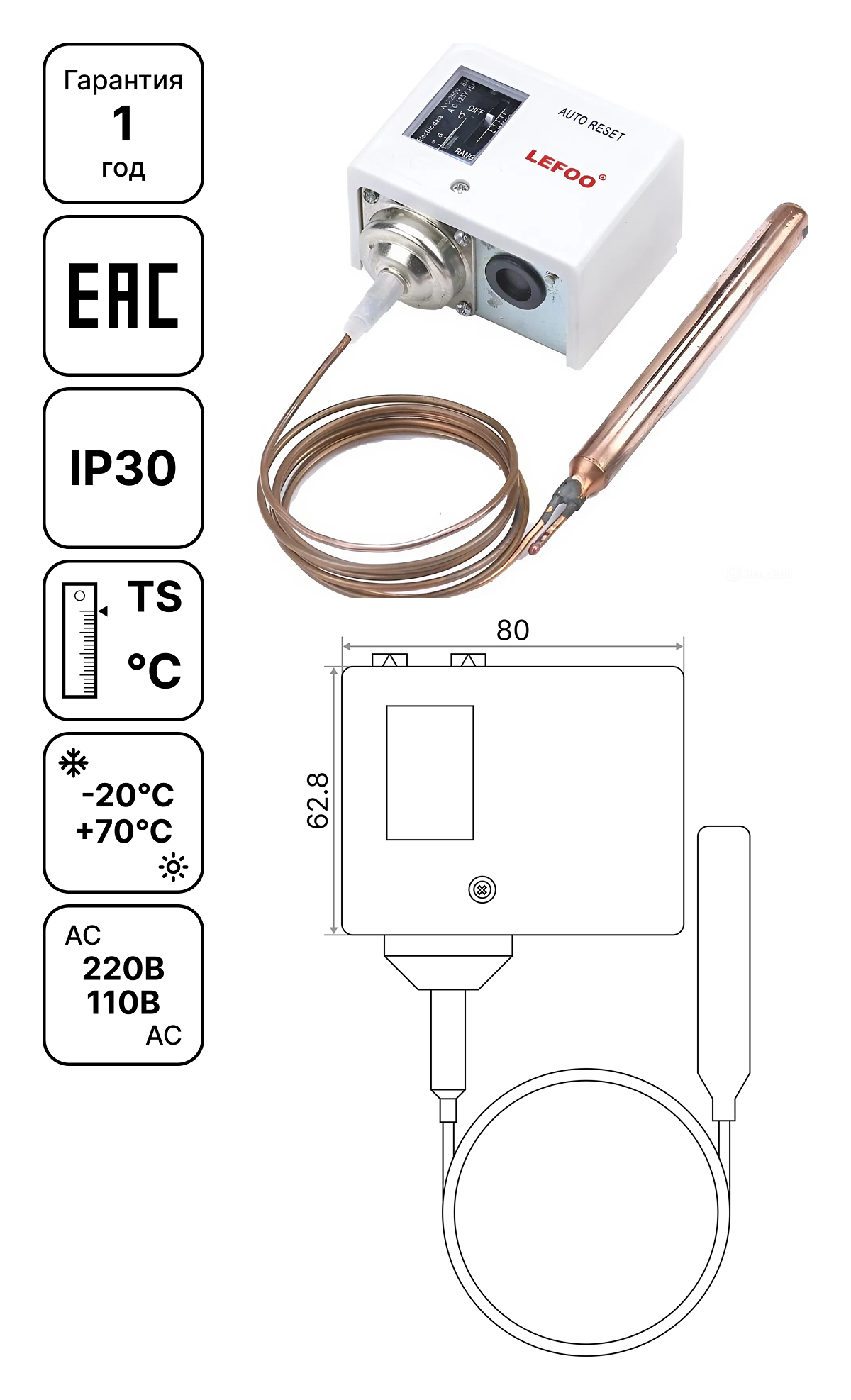 Реле температуры серии TS производства LEFOO – это автоматическое реле с капилляром длиной 1-1,5 метра и термобаллоном, размещенном на его конце, оснащённое двойным переключателем SPDT, положение контактов которого зависит от температуры контролируемой среды. Уставка срабатывания и гистерезис настраиваются в широком диапазоне температур (в зависимости от модели).